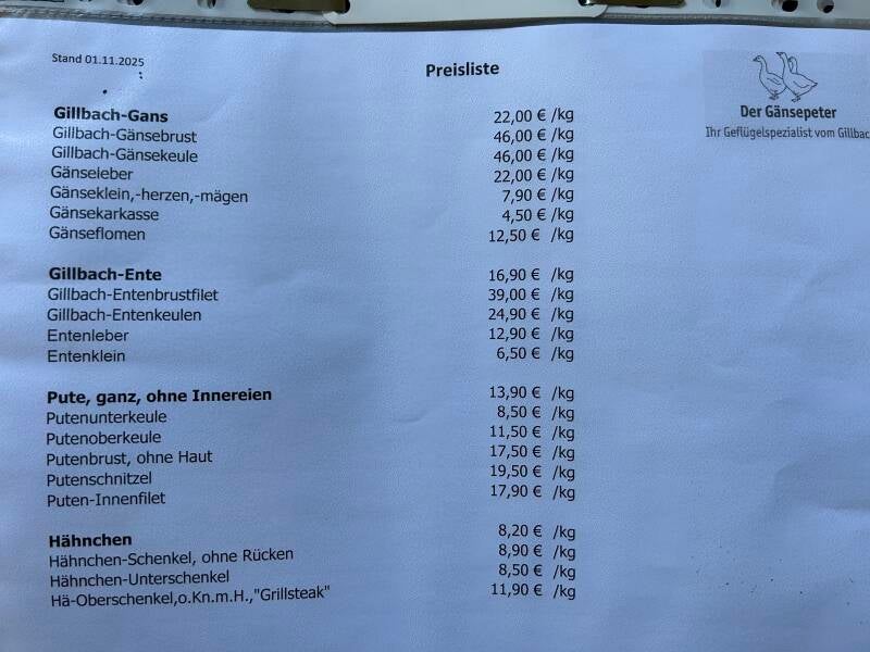 Liebe Kunden, wir haben eine Sortimentsliste vom Geflügel eingefügt. Alle aufgelisteten Produkte können sie bei uns bestellen. Wenn wir die Bestellung bis Samstags 14 Uhr erhalten, sind die Produkte in der darauffolgenden Woche, ab Donnerstags abholbereit.
